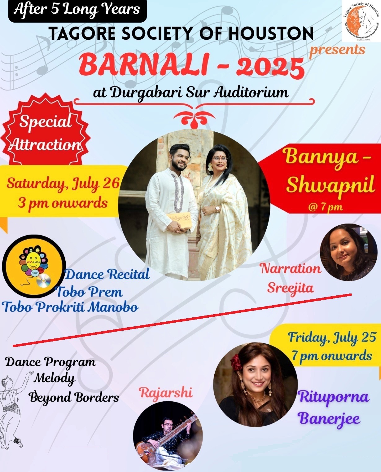 7:00PM Rabindra Sandya, duo of Bannya and Shwapnil, - a vibrant Tagore music in the heart of Texas!