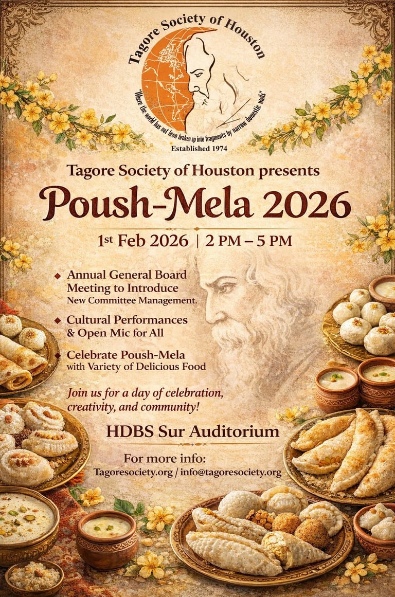 Tagore Society of Houston is a non-profit, tax-exempt charitable organization (Tax ID number 76-0447299) under Section 501(c)(3) of the Internal Revenue Code. Donations are tax-deductible as allowed by law.